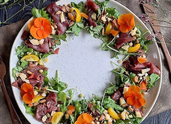 Das ganze Rezept ansehen: Carpaccio-Weihnachtskrans