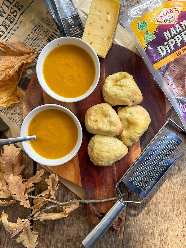Diese Kürbissuppe mit schmelzendem Bockshornklee-Käse ist pure Wärme in einer Schale. Süßer Kürbis, Knoblauch, Schalotten, rote Chili, Ingwer und Zitronengras werden zusammen zu einer cremigen, aromatischen Suppe gekocht. Servieren Sie die Suppe mit warmen Naan-Dipps, bestreut mit geriebenem Bockshornklee-Käse, für eine herzhafte, nussige Note. Perfekt für einen gemütlichen Abend zu Hause, an dem Komfort und Geschmack aufeinandertreffen.
