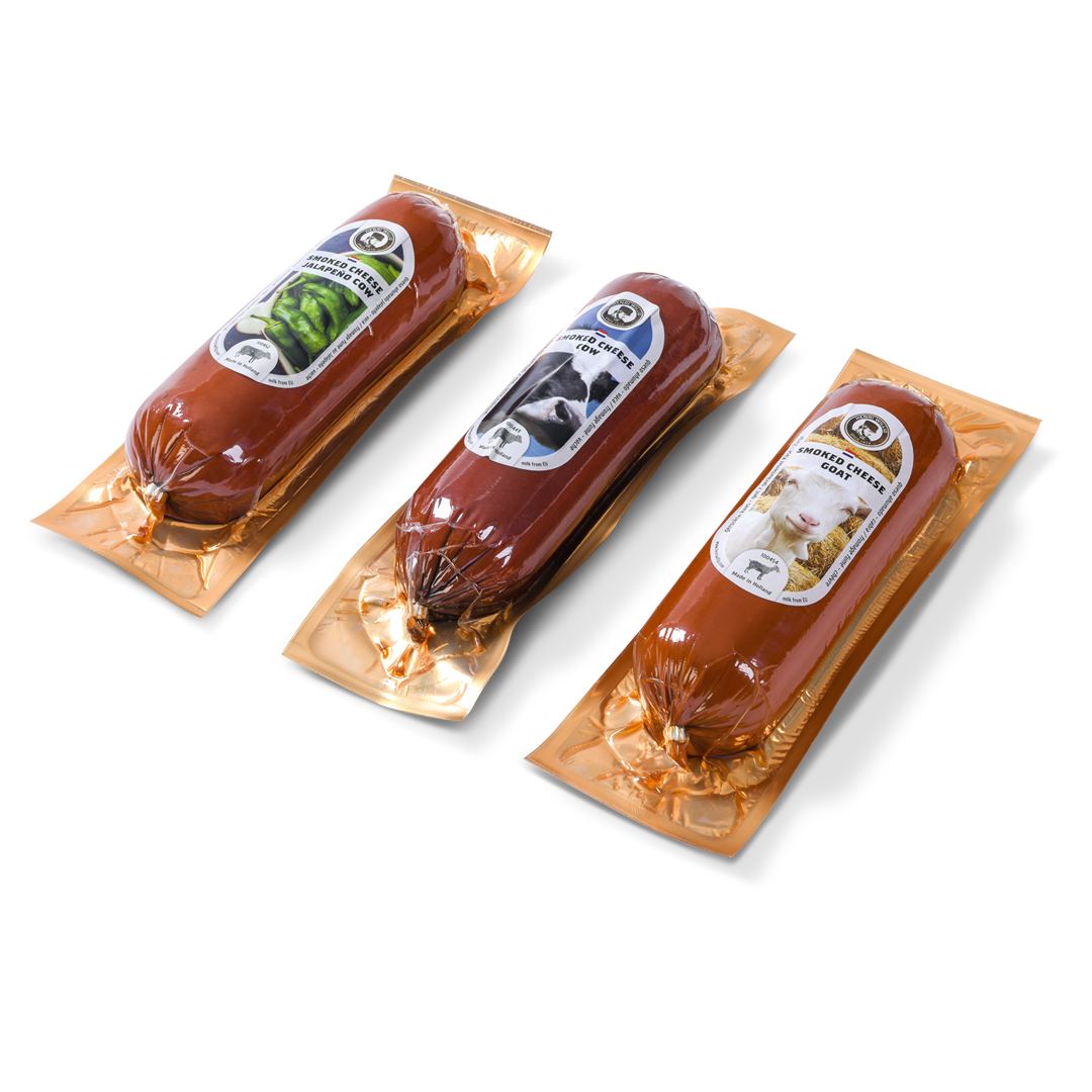 Koemelk Rookkaas, Geitenmelk Rookkaas en Rookkaas met Jalapeño. Elke kaas wordt met zorg bereid en gerookt op echt beukenhout, wat zorgt voor die karakteristieke, volle rooksmaak en de kenmerkende bruine, eetbare korst. Een echte traktatie voor liefhebbers van authentieke Hollandse kaas.